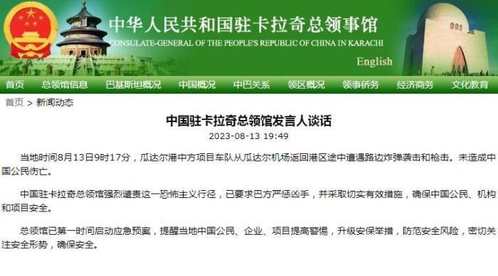 中國駐卡拉奇總領館強烈譴責這一恐怖主義行徑,已要求巴方嚴懲兇手,并采取切實有效措施,確保中國公民、機構和項目安全。
