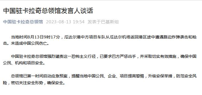 中國駐卡拉奇總領(lǐng)館強烈譴責(zé)這一恐怖主義行徑,已要求巴方嚴(yán)懲兇手,并采取切實有效措施,確保中國公民、機(jī)構(gòu)和項目安全。
