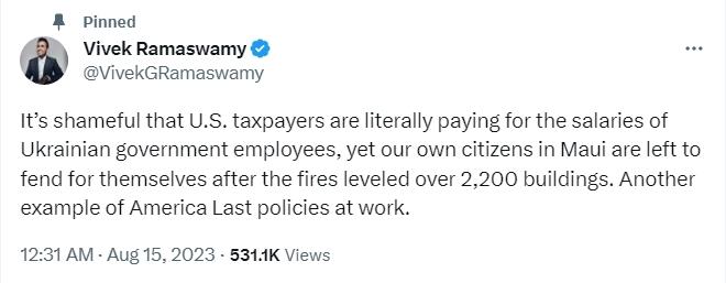該援烏計劃出臺之際,美國共和黨2024年總統(tǒng)競選人維韋克·拉馬斯瓦米隨后在社交媒體上寫道,“這是恥辱,美國納稅人實際在支付烏克蘭公職人員的工資,而我們毛伊島的公民在被大火摧毀的2200多棟建筑中自生自滅。這是又一個‘美國排在最后’的例子?!?/p>