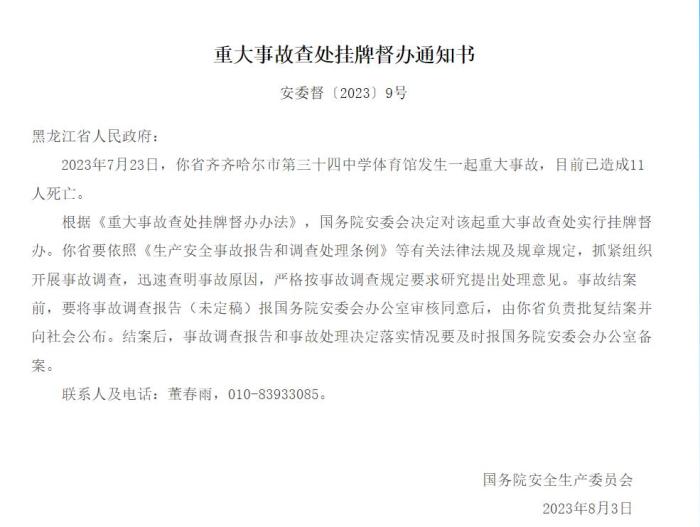 中新網(wǎng)8月14日電 據(jù)應(yīng)急管理部網(wǎng)站14日消息,國(guó)務(wù)院安委會(huì)發(fā)布重大事故查處掛牌督辦通知書。2023年7月23日,黑龍江省齊齊哈爾市第三十四中學(xué)體育館發(fā)生一起重大事故,目前已造成11人死亡。根據(jù)《重大事故查處掛牌督辦辦法》,國(guó)務(wù)院安委會(huì)決定對(duì)該起重大事故查處實(shí)行掛牌督辦。