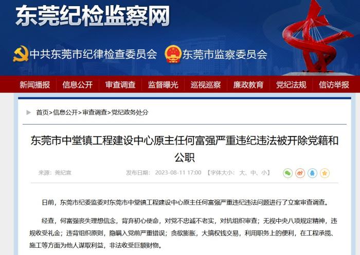 中新網北京8月14日電 近日,廣東東莞市紀委監(jiān)委發(fā)布消息,東莞市中堂鎮(zhèn)工程建設中心原主任何富強被“雙開”。