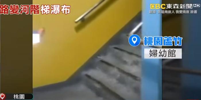 圖為臺(tái)灣桃園市蘆竹區(qū)婦女館的樓梯出現(xiàn)“小瀑布”。 圖片來(lái)源:臺(tái)灣東森新聞網(wǎng)視頻截圖