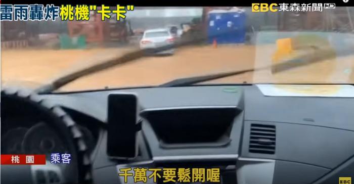 圖為臺(tái)灣桃園機(jī)場(chǎng)乘客涉水開(kāi)車(chē)通過(guò)積水路面。圖片來(lái)源:臺(tái)灣東森新聞網(wǎng)視頻截圖