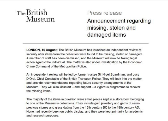 藏品丟失的具體時間沒有說明,但據大英博物館董事會董事長喬治·奧斯本表示,董事會成員在“今年早些時候”得知此事,非常擔憂。