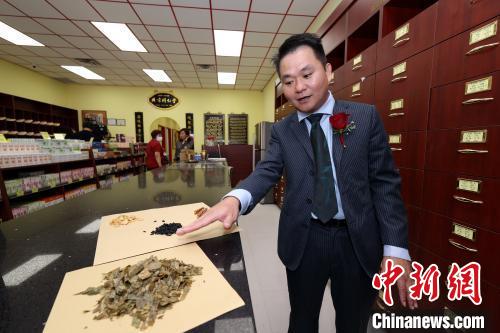 當(dāng)?shù)貢r(shí)間9月1日,加拿大多倫多,北京同仁堂位于大多倫多地區(qū)的第四家分店在安大略省列治文山(Richmond Hill)市開(kāi)業(yè)。圖為北京同仁堂(多倫多)有限公司副總經(jīng)理肖常國(guó)向記者介紹店內(nèi)中藥材?!≈行律缬浾?余瑞冬 攝