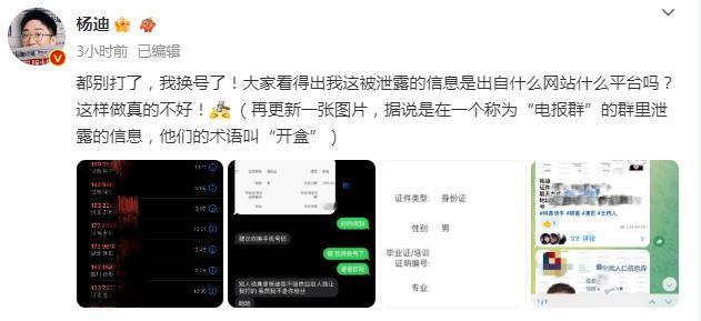 中新網(wǎng)北京9月4日電 今天,#楊迪信息被泄露#登上熱搜。從楊迪在微博上曬出的圖可以看到,他的電話已經(jīng)被打爆,無(wú)奈之下只能換手機(jī)號(hào)。
