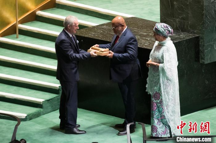 當(dāng)?shù)貢r(shí)間9月5日,第77屆聯(lián)合國(guó)大會(huì)在紐約聯(lián)合國(guó)總部閉幕。在聯(lián)合國(guó)常務(wù)副秘書(shū)長(zhǎng)阿明娜(右)的見(jiàn)證下,第77屆聯(lián)大主席克勒希(左一)將象征聯(lián)大主席權(quán)力的議事槌交給第78屆聯(lián)大主席弗朗西斯(中)。中新社記者 廖攀 攝