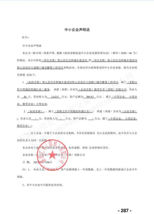 中標公告所附的中小企業(yè)聲明函顯示,睿澤藝術(shù)(深圳)有限公司從業(yè)人員45人,營業(yè)收入2.6213萬元,資產(chǎn)總額為709.83萬元。