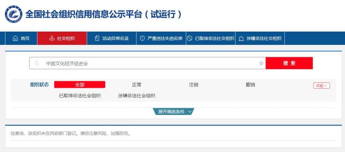 但中新財經(jīng)記者在全國社會組織信用信息公示平臺查詢發(fā)現(xiàn),中國城市雕塑建設(shè)研究院、中國文化經(jīng)濟促進會均未在民政部門登記。