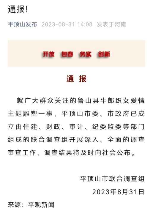 8月31日,“平頂山發(fā)布”公眾號發(fā)布通報,就廣大群眾關(guān)注的魯山縣牛郎織女愛情主題雕塑一事,平頂山市委、市政府已成立由住建、財政、審計、紀委監(jiān)委等部門組成的聯(lián)合調(diào)查組開展深入、全面的調(diào)查審查工作,調(diào)查結(jié)果將及時向社會公布。