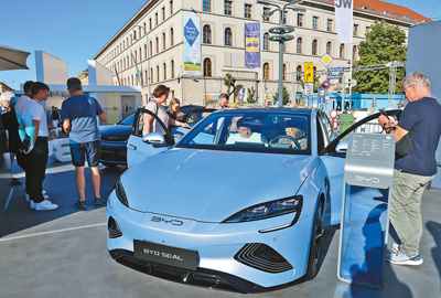 位于慕尼黑市中心的城市公共展示區(qū),不少觀眾參觀體驗(yàn)比亞迪電動(dòng)汽車(chē)。