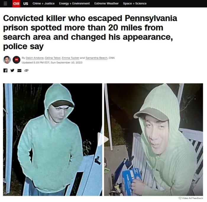 據(jù)報(bào)道,當(dāng)?shù)貢r(shí)間8月31日上午8時(shí)45分左右,卡瓦爾坎特從賓夕法尼亞州切斯特縣監(jiān)獄越獄,該地距離費(fèi)城約有1小時(shí)車(chē)程。自其越獄后,已多次被監(jiān)控拍到,也有目擊者見(jiàn)到過(guò)他。