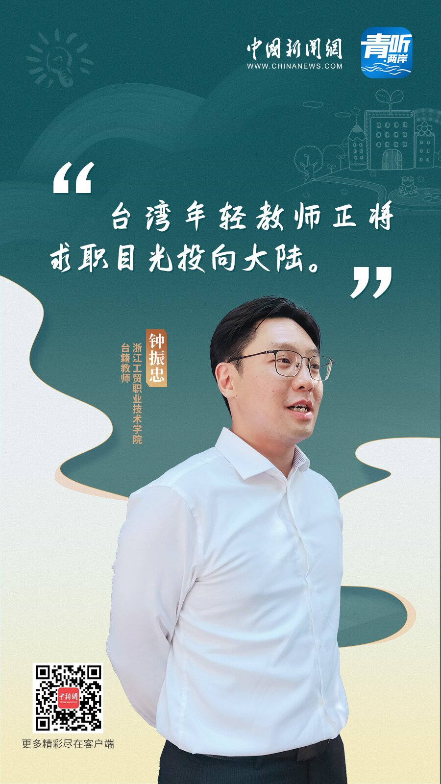 中新網(wǎng)9月10日電 (記者 程子倬 陳文韜)如今,越來(lái)越多的臺(tái)籍教師擁抱大陸發(fā)展機(jī)遇,赴大陸任教、立業(yè)筑夢(mèng),融入當(dāng)?shù)厣?。近日,在中?guó)新聞網(wǎng)《青聽(tīng)·兩岸》節(jié)目中,幾位在大陸不同教育機(jī)構(gòu)任職的臺(tái)灣青年教師分享了各自融入大陸教育行業(yè)的故事,以及他們對(duì)大陸教育事業(yè)的觀察。
