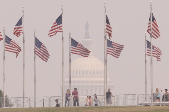6月29日,在美國首都華盛頓,游客在華盛頓紀(jì)念碑游覽,遠(yuǎn)處的國會(huì)大廈籠罩在煙霧中。新華社發(fā)(亞倫攝)