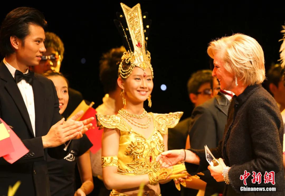 2011年9月,比利時(shí)公主阿斯特里德(右)在布魯塞爾觀看中國殘疾人藝術(shù)團(tuán)傾情奉獻(xiàn)的演出——《我的夢(mèng)》。圖為阿斯特里德公主向演員致謝。沈晨 攝