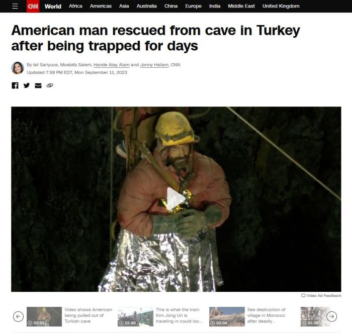 中新網(wǎng)9月12日電 綜合外媒報道,當?shù)貢r間12日凌晨,被困在土耳其一處地下洞穴1000多米深處多日的美國洞穴探險家馬克·迪基,被成功救出。