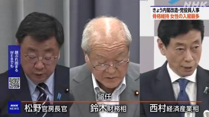 新一屆內閣中,日本內閣官房長官、財務大臣和經(jīng)濟產業(yè)大臣等職位沒有進行調整。圖片來源:日本放送協(xié)會(NHK)報道截圖