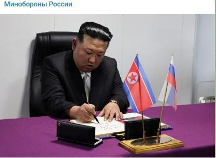 當?shù)貢r間16日,金正恩在俄“沙波什尼科夫元帥”號護衛(wèi)艦貴賓簿上留言。圖片來源:俄國防部社交媒體截圖