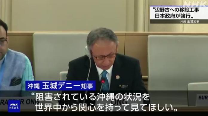 當(dāng)?shù)貢r(shí)間18日,日本沖繩縣知事玉城丹尼在瑞士日內(nèi)瓦召開的聯(lián)合國人權(quán)理事會(huì)上,抨擊美日政府不顧沖繩民眾民意強(qiáng)行推進(jìn)美軍基地搬遷。圖片來源:日本放送協(xié)會(huì)(NHK)視頻截圖