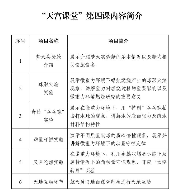 本次太空授課活動繼續(xù)采取天地互動方式進(jìn)行。3名航天員將在軌展示介紹中國空間站夢天實(shí)驗艙工作生活場景,演示球形火焰實(shí)驗、奇妙“乒乓球”實(shí)驗、動量守恒實(shí)驗以及又見陀螺實(shí)驗,并與地面課堂進(jìn)行互動交流。