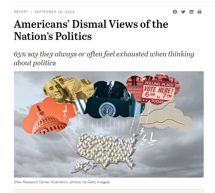 近三分之二的人(65%)表示,他們在思考政治時(shí)總是或經(jīng)常感到疲憊,而55%的人感到憤怒。相比之下,只有10%的人說他們總是或經(jīng)常對政治抱有希望。