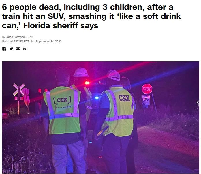 中新網(wǎng)9月25日電 據(jù)美國有線電視新聞網(wǎng)(CNN)24日報道,當(dāng)?shù)貢r間23日晚,美國佛羅里達(dá)州希爾斯伯勒縣一列火車在經(jīng)過鐵路口時與一輛SUV汽車相撞,造成6人遇難,其中包括3名兒童。