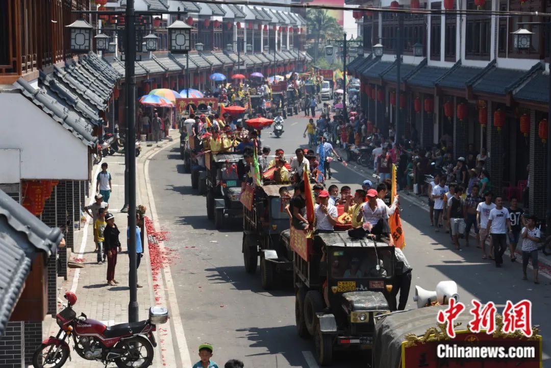 2015年4月3日,海南瓊海市萬泉鎮(zhèn)鬧“軍坡”車隊在墟鎮(zhèn)上巡游。蒙鐘德 攝