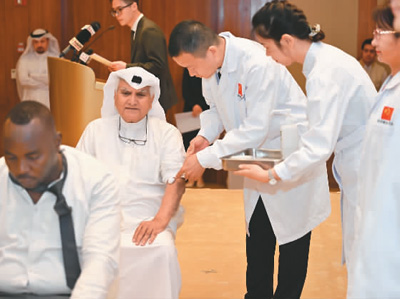 中國(guó)(吉林)第15批援科威特醫(yī)療隊(duì)在展示針灸治療。