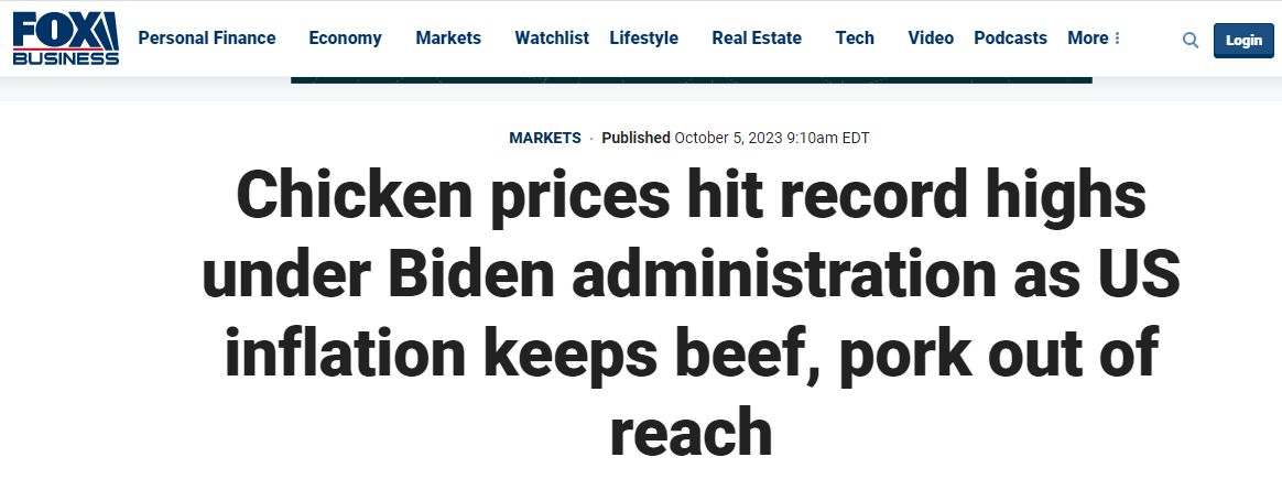 另據(jù)美國??怂股虡I(yè)頻道(Fox Business)網(wǎng)站報(bào)道,受到持續(xù)通貨膨脹影響,美國牛肉和豬肉價(jià)格保持高位,普通消費(fèi)者不得不轉(zhuǎn)向略微便宜一些的雞肉。然而,全美零售店的雞肉價(jià)格也隨著需求量的增加而水漲船高,更是創(chuàng)下歷史新高,并且預(yù)計(jì)還將保持在高位。