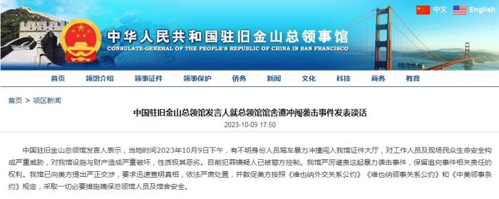 中新網(wǎng)10月10日電 據(jù)中國駐舊金山總領(lǐng)館網(wǎng)站消息,中國駐舊金山總領(lǐng)館發(fā)言人表示,當(dāng)?shù)貢r(shí)間2023年10月9日下午,有不明身份人員駕車暴力沖撞闖入中國駐舊金山總領(lǐng)館證件大廳,對(duì)工作人員及現(xiàn)場民眾生命安全構(gòu)成嚴(yán)重威脅,對(duì)中國駐舊金山總領(lǐng)館設(shè)施與財(cái)產(chǎn)造成嚴(yán)重破壞,性質(zhì)極其惡劣。