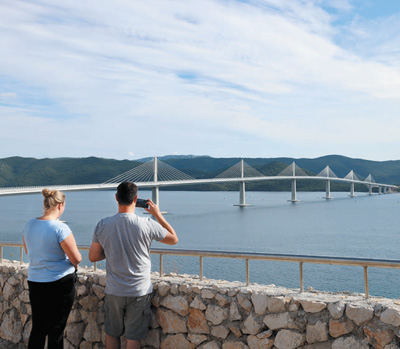 沿著克羅地亞狹長(zhǎng)的海岸線一路向南行駛到科馬爾納地區(qū),遠(yuǎn)遠(yuǎn)就能望見(jiàn)如銀鏈般橫臥在山海之間的佩列沙茨大橋。在橋頭一側(cè)的休息區(qū),人們紛紛停下車來(lái),對(duì)著大橋拍照留念。來(lái)自克羅地亞北部的卡塞爾和朋友們特地自駕來(lái)到這里,開(kāi)心地請(qǐng)本報(bào)記者幫忙合影。“佩列沙茨大橋連通了克羅地亞南北領(lǐng)土,是我們心中最美的大橋!”卡塞爾說(shuō)。