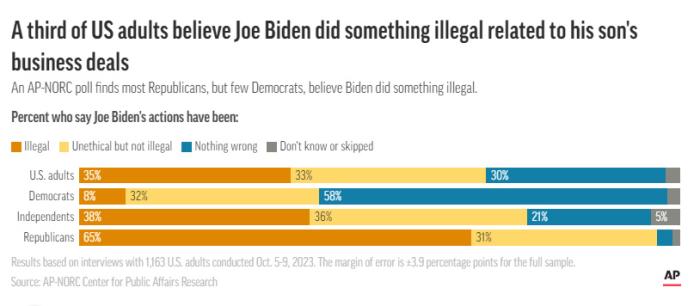 據(jù)報道,共和黨人中65%認(rèn)為拜登在與亨特·拜登的業(yè)務(wù)關(guān)系中存在非法行為,而只有8%的民主黨人這么認(rèn)為。與共和黨人相比(31%),更多的民主黨人(32%)表示他們認(rèn)為拜登的行為“不道德”,但并未 “違法”。58%的民主黨人表示,拜登 “沒有做錯任何事”。