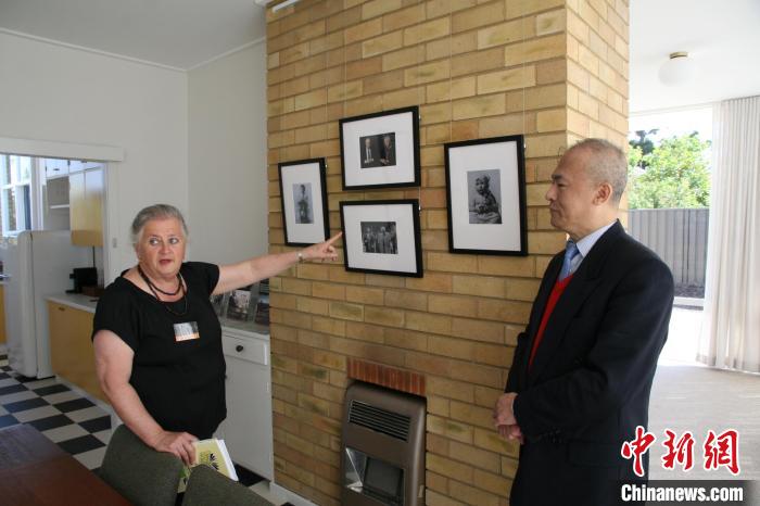 10月14日,惠特拉姆故居管理人員(左)向參訪者介紹惠特拉姆生前訪問中國的相關照片。中新社記者 顧時宏 攝
