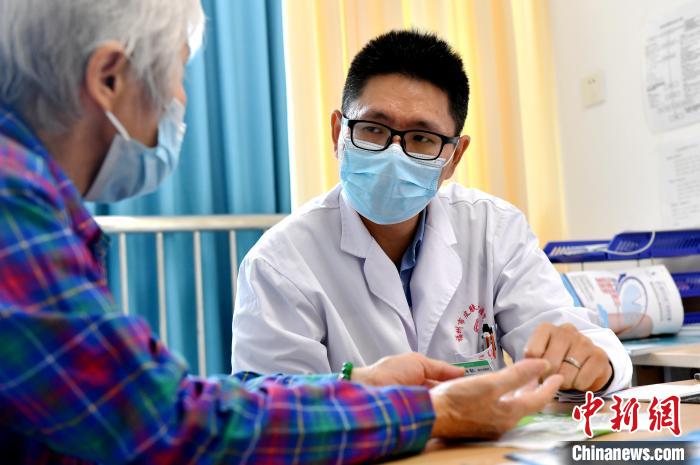 10月9日,現就職于福州市皮膚病防治院的臺籍醫(yī)生陳柏叡在與一名患者交流?!≈行律缬浾?呂明 攝