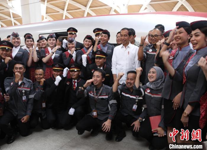 9月13日,印度尼西亞總統(tǒng)佐科考察中印尼合作項目雅萬高鐵,并在哈利姆站乘坐G5901次高鐵列車赴帕達(dá)拉朗站。這是他首次乘坐雅萬高鐵。圖為佐科在哈利姆站與乘務(wù)人員合影?!≈行律缬浾?李志全 攝