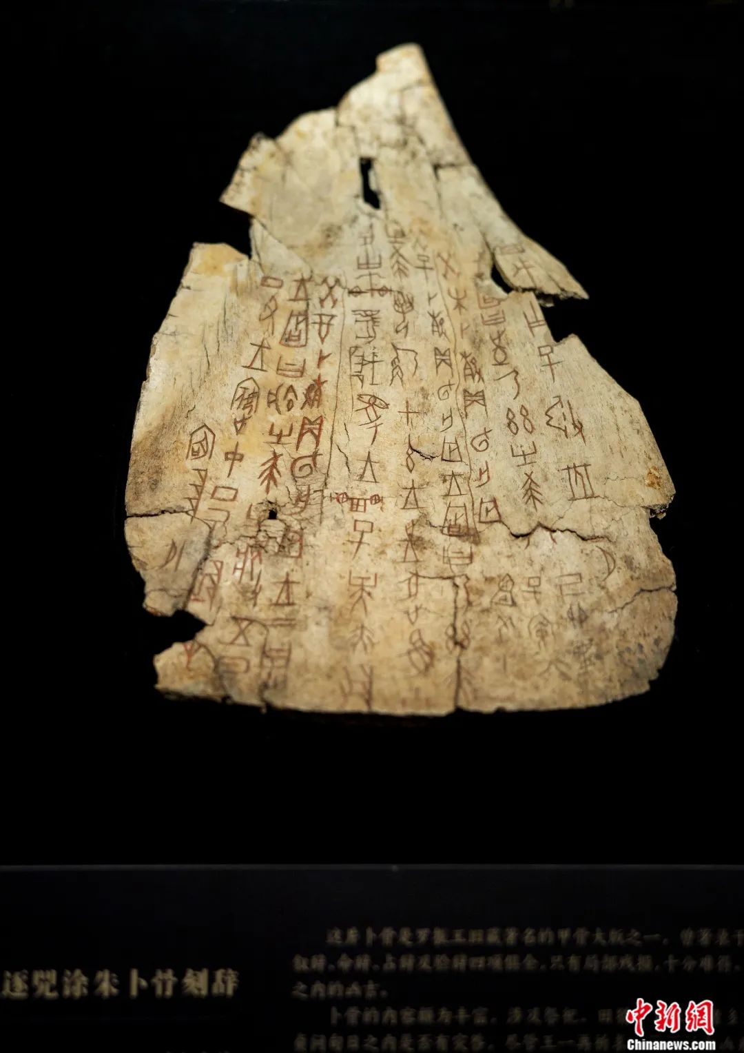 資料圖:位于北京的國家博物館內(nèi)的“證古澤今——甲骨文文化展”展出的“王賓中丁·王往逐兕涂朱卜骨刻辭”卜骨。侯宇 攝