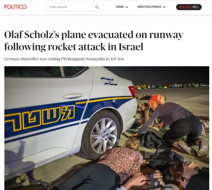 當(dāng)?shù)貢r(shí)間17日晚,德國總理朔爾茨在以色列本古里安機(jī)場登機(jī)前突遇火箭彈襲擊,人員緊急躲避。圖片來源:美國政治新聞網(wǎng)報(bào)道截圖