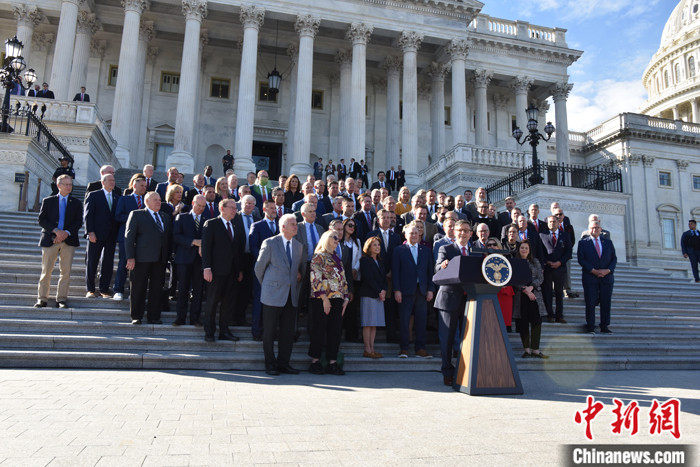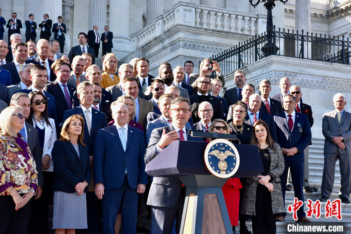 圖為約翰遜當選議長后在記者會上表示,過去幾周的議長選舉讓共和黨人“更強大”,“我們將立刻全力以赴開始工作”。 中新社記者 沙晗汀 攝