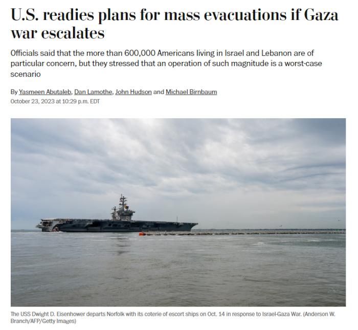 報(bào)道還稱,根據(jù)美國政府可能展開的撤離公民行動(dòng)的規(guī)模,這場行動(dòng)可能比以往的任何撤離公民行動(dòng)都更加困難。此次行動(dòng)可能涉及10月已經(jīng)“涌入”中東地區(qū)的美國空軍飛機(jī)和海軍艦艇。
