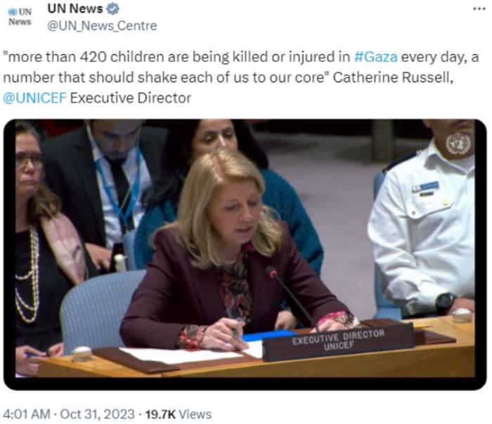 中新網(wǎng)10月31日電 據(jù)聯(lián)合國新聞消息,當(dāng)?shù)貢r(shí)間30日,聯(lián)合國兒童基金會(huì)執(zhí)行主任凱瑟琳·拉塞爾表示,最新統(tǒng)計(jì)數(shù)據(jù)顯示,目前加沙地帶每天至少有420名兒童死亡和受傷。