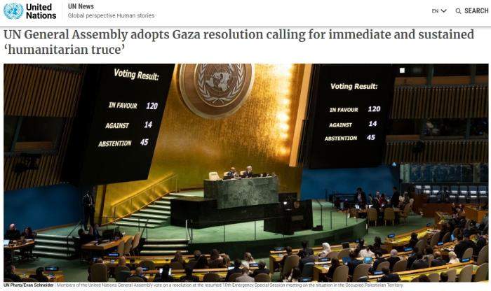 據(jù)聯(lián)合國網(wǎng)站消息,紐約當(dāng)?shù)貢r間27日下午,第78屆聯(lián)大以125票贊成、14票反對和45票棄權(quán)的表決結(jié)果,通過了由約旦代表阿拉伯國家集團(tuán)提交的一份聯(lián)大決議草案。