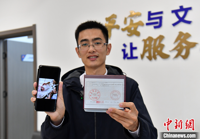 圖為新生兒父親展示女兒照片和帶有“河北雄安新區(qū)”字樣的戶口頁。 中新社記者 韓冰 攝
