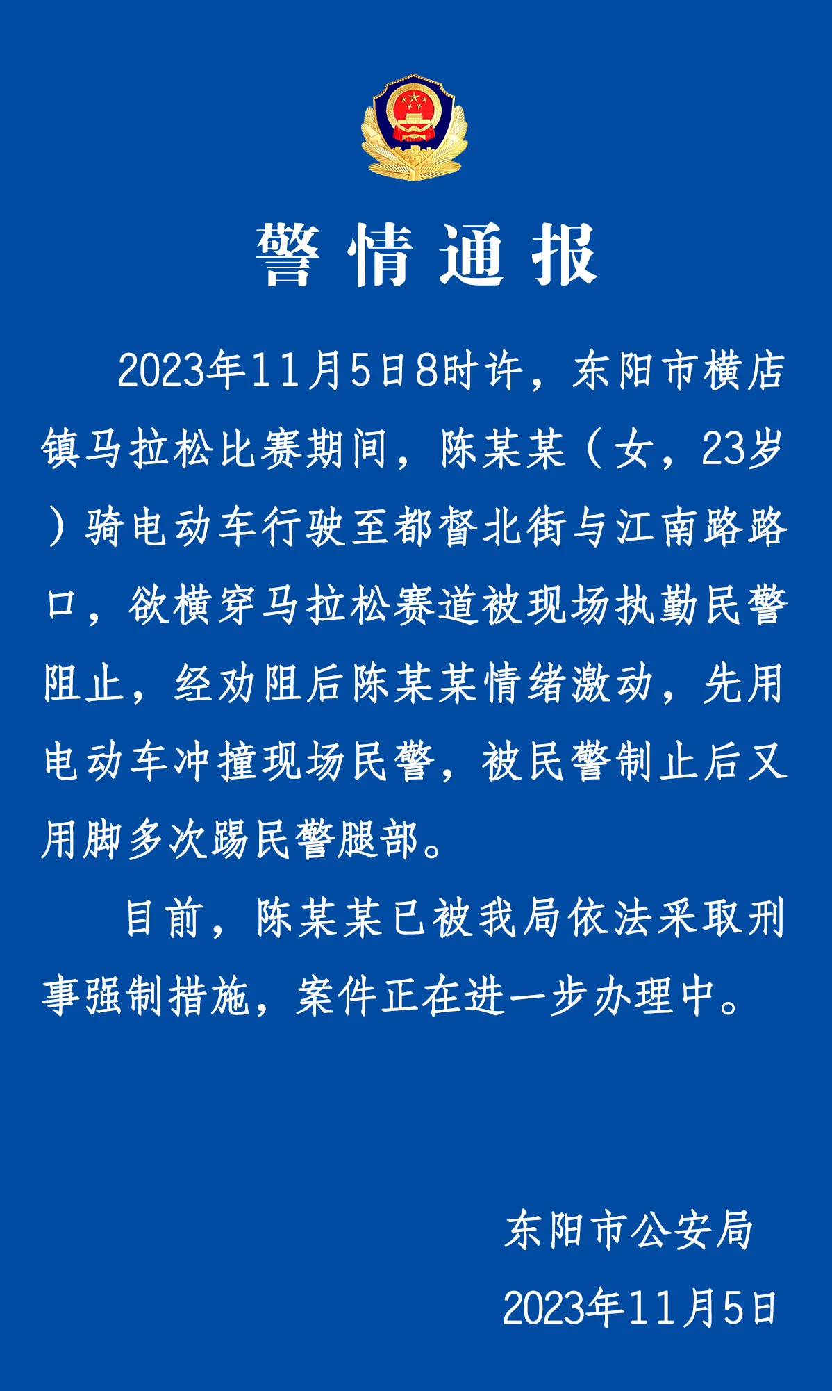 中新網(wǎng)金華11月6日電(董易鑫)浙江金華東陽市公安局11月5日發(fā)布警情通報(bào)稱,2023年11月5日8時(shí)許,東陽市橫店鎮(zhèn)馬拉松比賽期間,陳某某(女,23歲)騎電動(dòng)車行駛至都督北街與江南路路口,欲橫穿馬拉松賽道被現(xiàn)場(chǎng)執(zhí)勤民警阻止,經(jīng)勸阻后陳某某情緒激動(dòng),先用電動(dòng)車沖撞現(xiàn)場(chǎng)民警,被民警制止后又用腳多次踢民警腿部。