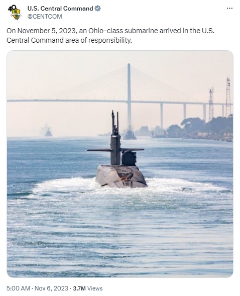 據報道,當天,美國中央司令部在社交媒體上發(fā)帖稱,“11月5日,一艘‘俄亥俄’級戰(zhàn)略潛艇抵達中東地區(qū)?!?/p>