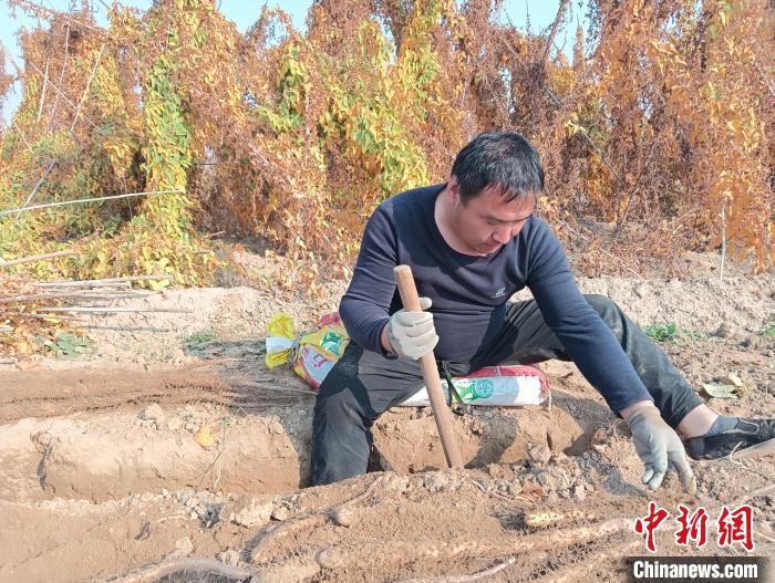 11月3日上午,山西新絳縣龍興鎮(zhèn)橋東村村民郭龍正在挖山藥。站著挖、跪著挖、坐著挖……雖然氣溫不高,他的額頭還是掛滿汗珠。