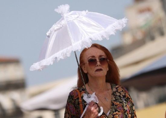 7月19日,在法國南部城市蒙彼利埃,一名女子用遮陽傘遮陽。新華社記者高靜攝