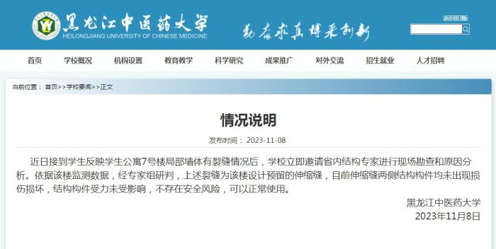 中新網(wǎng)11月9日電 據(jù)黑龍江中醫(yī)藥大學網(wǎng)站消息,近日,黑龍江中醫(yī)藥大學接到學生反映學生公寓7號樓局部墻體有裂縫情況后,學校立即邀請省內(nèi)結構專家進行現(xiàn)場勘查和原因分析。依據(jù)該樓監(jiān)測數(shù)據(jù),經(jīng)專家組研判,上述裂縫為該樓設計預留的伸縮縫,目前伸縮縫兩側結構構件均未出現(xiàn)損傷損壞,結構構件受力未受影響,不存在安全風險,可以正常使用。