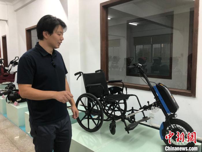 10月17日,臺灣青年楊博弘向記者介紹公司新產(chǎn)品電動輪椅車頭。中新社記者 孫秋霞 攝