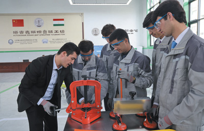 2022年,中亞地區(qū)首家魯班工坊在塔吉克斯坦啟動運(yùn)營,為塔吉克斯坦開展職業(yè)培訓(xùn)作出了積極貢獻(xiàn)。圖為今年4月,在塔吉克斯坦魯班工坊,塔方教授向?qū)W生介紹中方捐贈的設(shè)備。