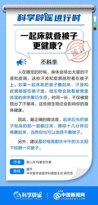 中新網(wǎng)11月17日電 人在睡覺的時候,身體會排出大量的汗液和皮屑,這些汗液和皮屑就附著在被子上。如果一起床就把被子疊起來,汗液和皮屑都留在被子里,微生物會就著被窩里體溫的余熱繁衍生息。時間一長,不僅被窩捂出了汗臭味,這些微生物還會影響你的身體健康。(來源:@科學辟謠 @中國新聞網(wǎng) )